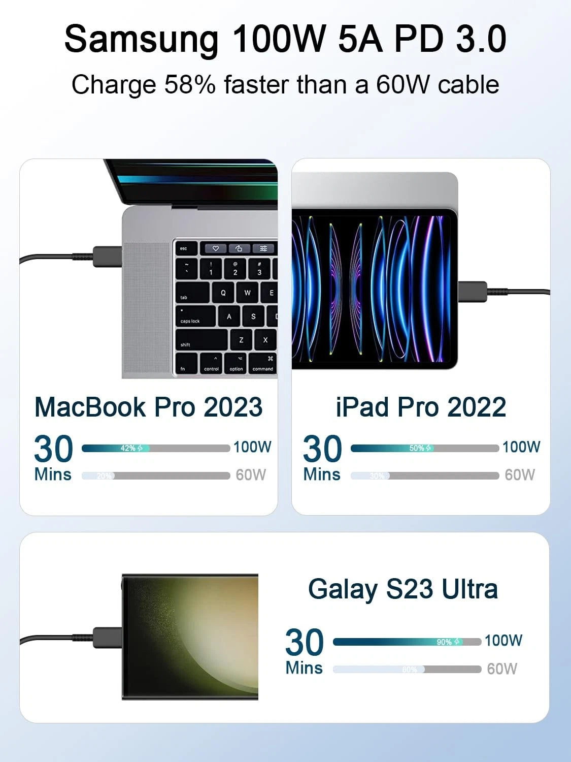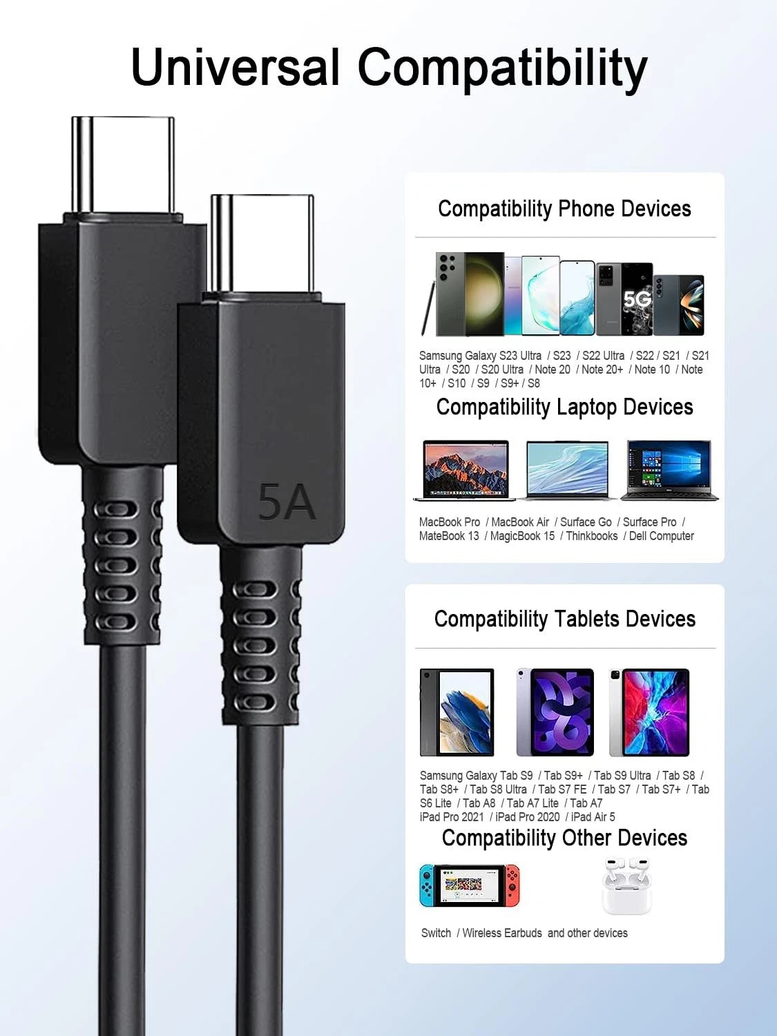 Our cable works seamlessly with leading devices such as Samsung Galaxy S24/S23/S22, MacBook Pro (2018-2021), and various tablets including iPad Pro. Additionally, it supports devices from Dell, HP, Lenovo, Google Pixel, and more.