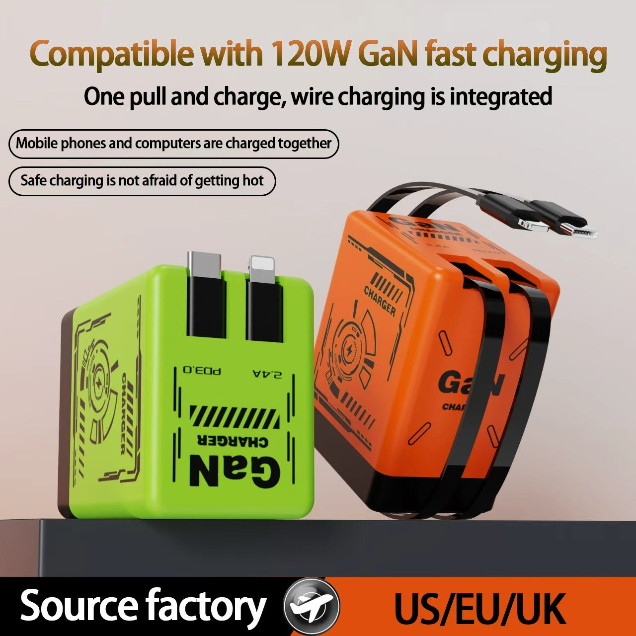 Compact, travel-ready 120W GaN wall charger with two built-in retractable cables (80cm). Supports PD, QC and PPS protocols for phones, tablets, laptops and more.